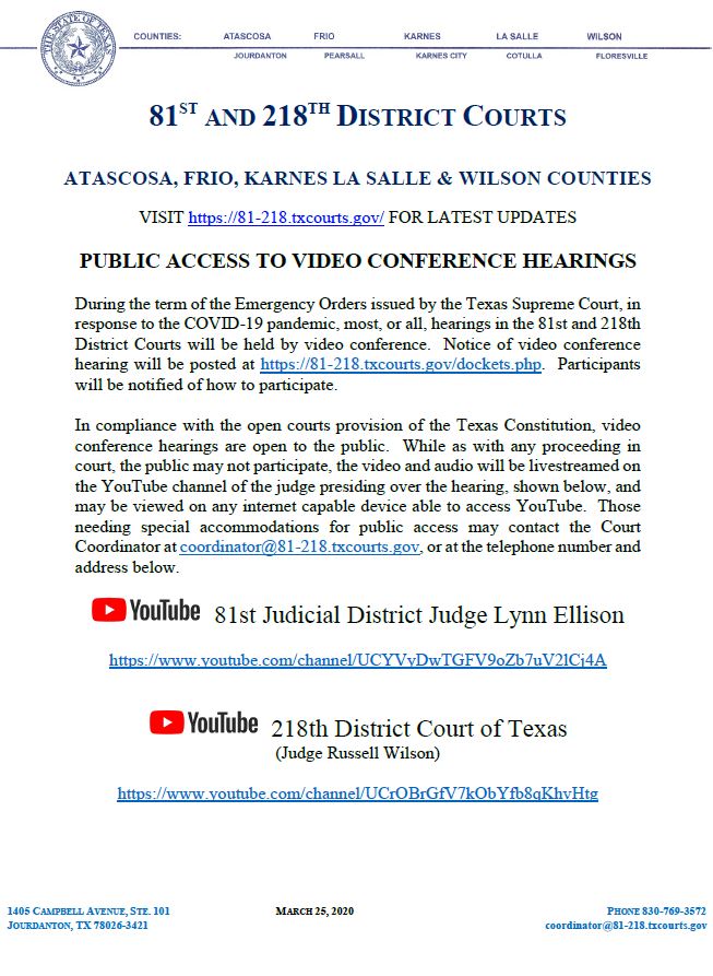 Below you will find the latest directives for court proceedings in the 81st & 218th Judicial Districts. Click on the linked title to review directive details.